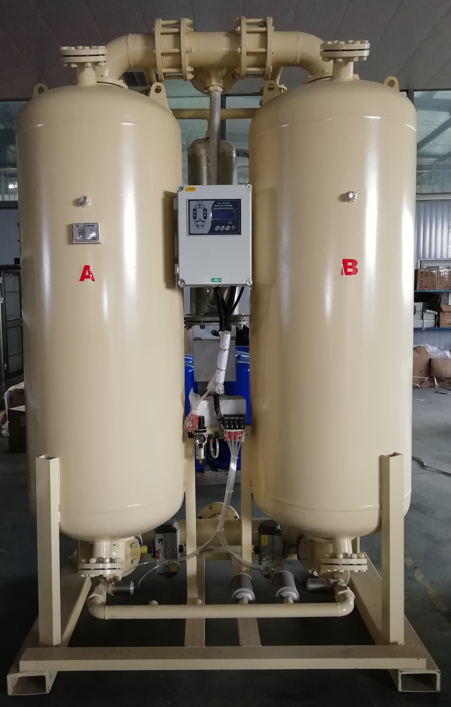 由空壓機(jī)排出的大量空氣,由壓縮空氣入口管流入,通過(guò)氣閥進(jìn)入兩個(gè)塔中的運(yùn)轉(zhuǎn)塔,其中的濕氣會(huì)被吸附劑所吸收而干燥。當(dāng)空氣流通到塔頂時(shí),空氣中的水份被全部吸收,露點(diǎn)溫度可達(dá)-40℃,從而達(dá)到干燥目的。整個(gè)循環(huán)標(biāo)準(zhǔn)需10分鐘,每塔各運(yùn)行5分鐘,一塔在工作的過(guò)程中(運(yùn)轉(zhuǎn)塔),另一塔處于再生狀態(tài)(非運(yùn)轉(zhuǎn)塔)再生時(shí)間為4.5分鐘,在再生的過(guò)程中,運(yùn)轉(zhuǎn)塔中一部份干燥的空氣經(jīng)再生風(fēng)量調(diào)節(jié)閥進(jìn)入非運(yùn)轉(zhuǎn)塔將塔內(nèi)的水份經(jīng)消音器帶到大氣中去。其運(yùn)轉(zhuǎn)時(shí)耗氣量為設(shè)備處理量的12%