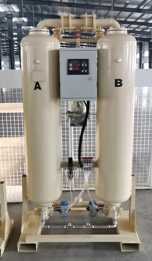 微熱吸干機(jī)綜合變壓吸附和變溫吸附之優(yōu)點(diǎn),在常溫高蒸汽分壓下吸附(工作);在較高溫度,低蒸汽分壓下解析(生),即吸附劑在吸附過程中吸附的水份,在再生過程依靠高品質(zhì)再生產(chǎn)(干燥空氣加熱)的熱擴(kuò)散和低分壓兩種機(jī)理的共同作用而得以清除。吸附濕空氣從下管系經(jīng)A1閥進(jìn)入A干燥罐體,自下向上 流過吸附劑床,干燥后的空氣從上管系排出。再生/吹冷 少量干燥空氣(約7%)通過上管系再生氣調(diào)節(jié)閥減壓后進(jìn)入加熱器加熱,這部分熱空氣(稱為再生氣)進(jìn)入B干燥罐。對(duì)B罐體內(nèi)的吸附劑解析再生,恢復(fù)吸附劑的干燥能力,再生氣通過下管系B2閥排放到大氣中。均壓吸附劑再生結(jié)束后,B2閥關(guān)閉,B干燥罐逐漸升壓至在線工作壓力,準(zhǔn)備切換。切換下管系B1閥打開,A1閥關(guān)閉,A2閥打開,A、B兩干燥罐完成切換,B罐進(jìn)入吸附,A罐卸壓再生。工作順序、工作時(shí)間及加熱溫度由控制器自動(dòng)控制完成。