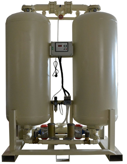 由空壓機(jī)排出的大量空氣,由壓縮空氣入口管流入,通過氣閥進(jìn)入兩個(gè)塔中的運(yùn)轉(zhuǎn)塔,其中的濕氣會(huì)被吸附劑所吸收而干燥。當(dāng)空氣流通到塔頂時(shí),空氣中的水份被全部吸收,露點(diǎn)溫度可達(dá)-40℃,從而達(dá)到干燥目的。整個(gè)循環(huán)標(biāo)準(zhǔn)需10分鐘,每塔各運(yùn)行5分鐘,一塔在工作的過程中(運(yùn)轉(zhuǎn)塔),另一塔處于再生狀態(tài)(非運(yùn)轉(zhuǎn)塔)再生時(shí)間為4.5分鐘,在再生的過程中,運(yùn)轉(zhuǎn)塔中一部份干燥的空氣經(jīng)再生風(fēng)量調(diào)節(jié)閥進(jìn)入非運(yùn)轉(zhuǎn)塔將塔內(nèi)的水份經(jīng)消音器帶到大氣中去。其運(yùn)轉(zhuǎn)時(shí)耗氣量為設(shè)備處理量的12%