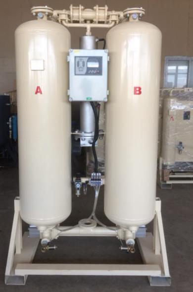 微熱吸干機綜合變壓吸附和變溫吸附之優點,在常溫高蒸汽分壓下吸附(工作);在較高溫度,低蒸汽分壓下解析(生),即吸附劑在吸附過程中吸附的水份,在再生過程依靠品質再生產(干燥空氣加熱)的熱擴散和低分壓兩種機理的共同作用而得以清除。吸附濕空氣從下管系經A1閥進入A干燥罐體,自下向上 流過吸附劑床,干燥后的空氣從上管系排出。再生/吹冷 少量干燥空氣(約7%)通過上管系再生氣調節閥減壓后進入加熱器加熱,這部分熱空氣(稱為再生氣)進入B干燥罐。對B罐體內的吸附劑解析再生,恢復吸附劑的干燥能力,再生氣通過下管系B2閥排放到大氣中。均壓吸附劑再生結束后,B2閥關閉,B干燥罐逐漸升壓至在線工作壓力,準備切換。切換下管系B1閥打開,A1閥關閉,A2閥打開,A、B兩干燥罐完成切換,B罐進入吸附,A罐卸壓再生。工作順序、工作時間及加熱溫度由控制器自動控制完成。